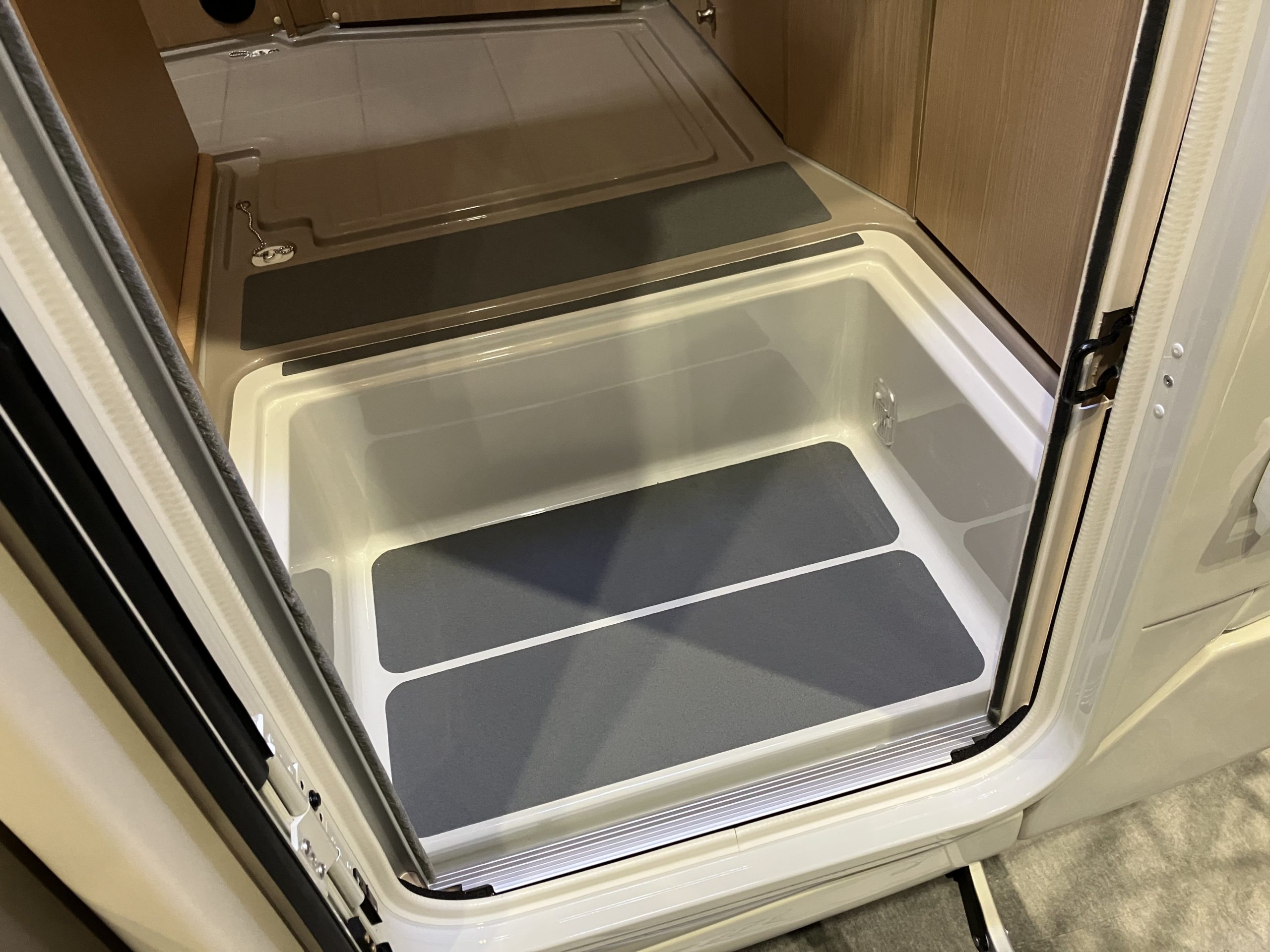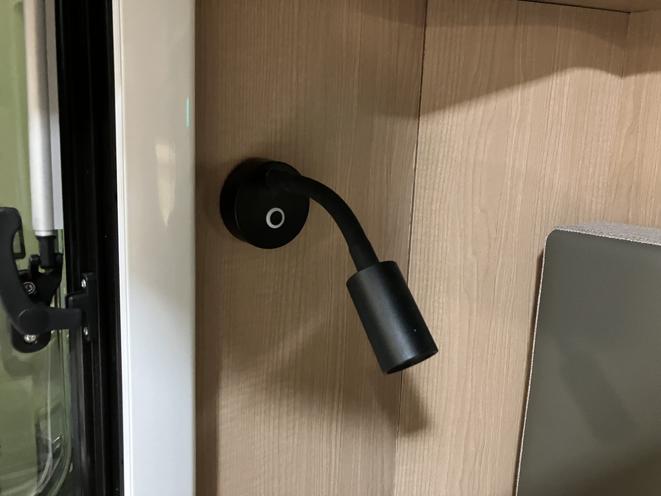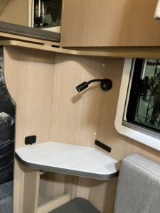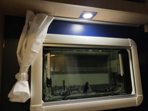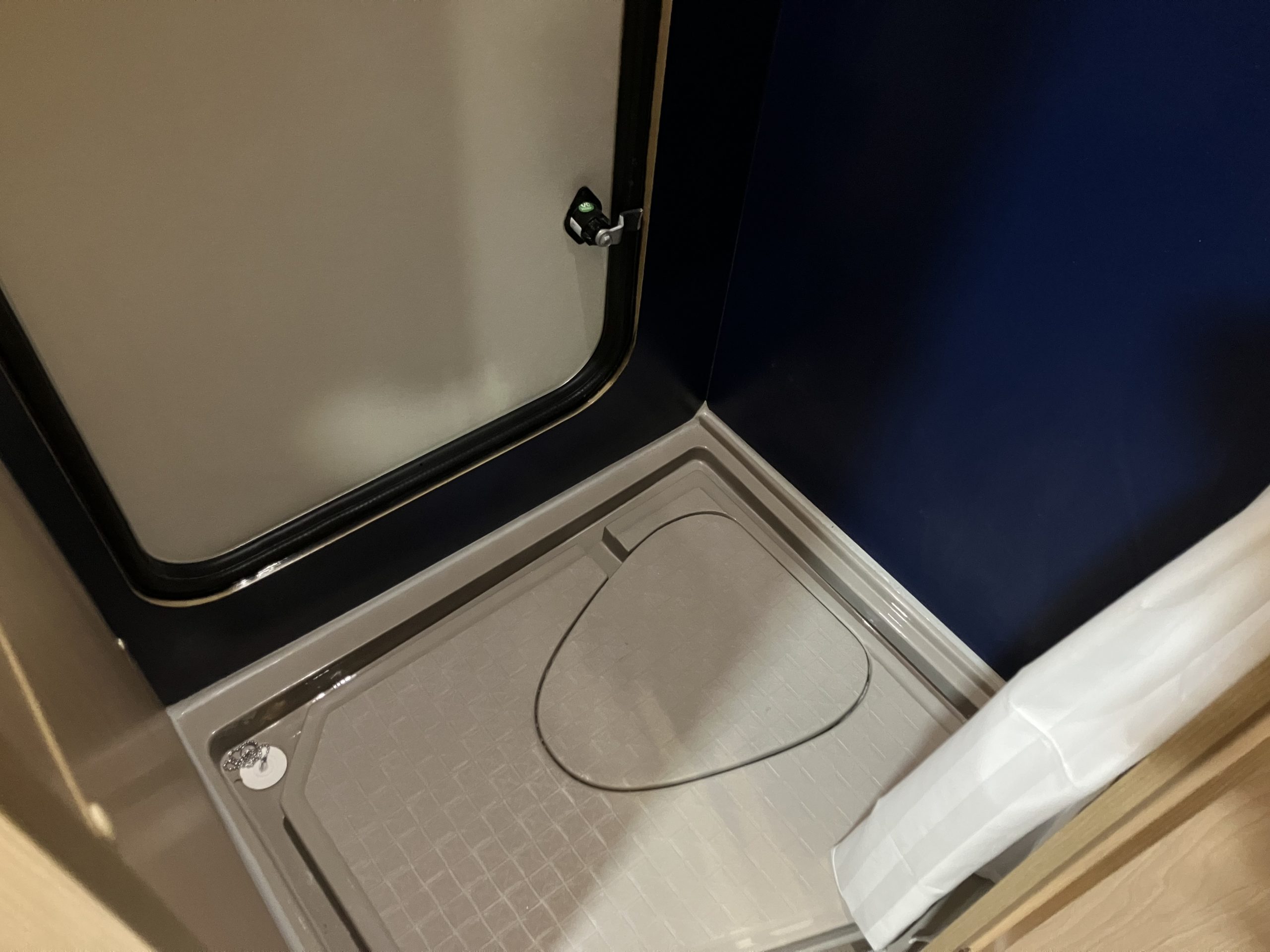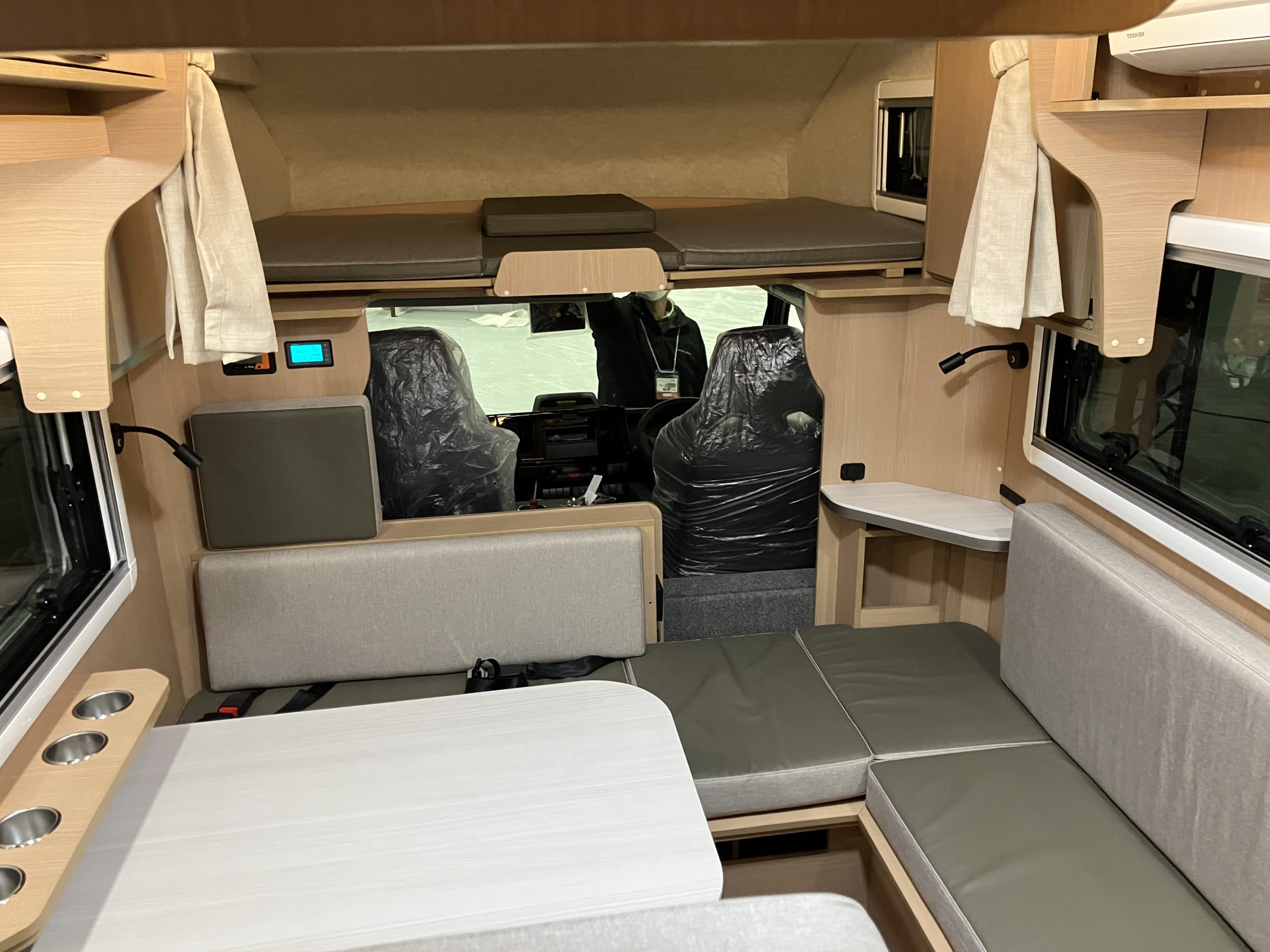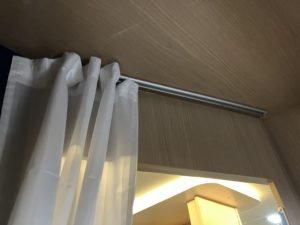 カーテンは展示車の為、通常と異なったものがついていますが他の車種と同じ360°シャワーカーテンがオプションで選択できるようです!