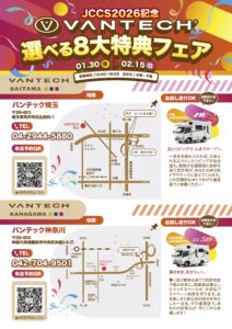 さらに1月30日〜2月15日までの間、VANTECH神奈川/VANTECH埼玉の両店舗ではジャパンキャンピングカーショー開催を記念して「選べる8大特典フェア」を開催致します!