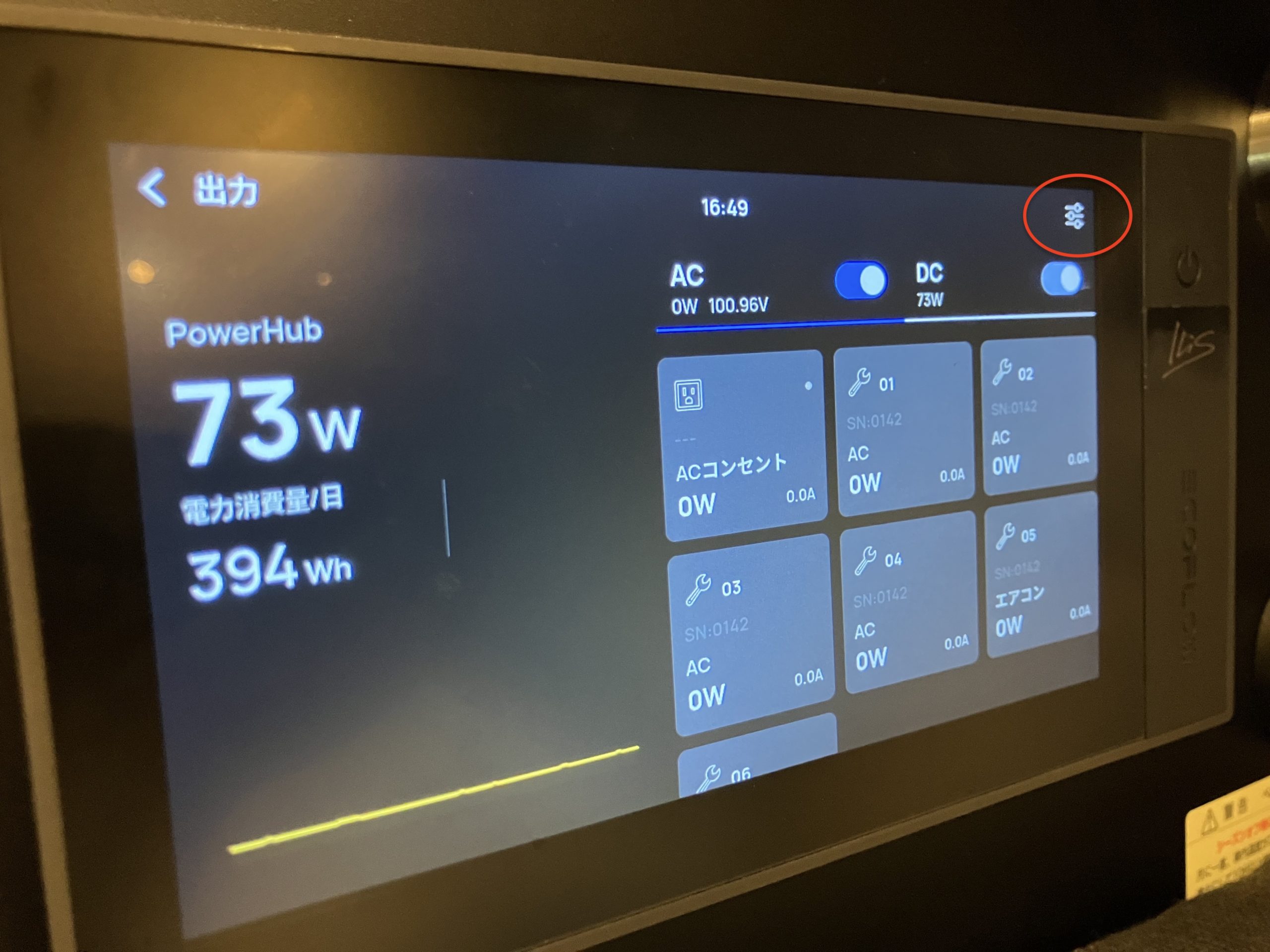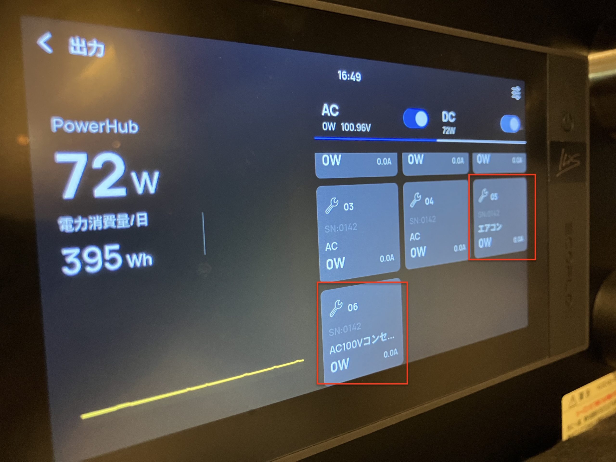 この画面からはAC一括とDC一括のON/OFF操作しか行えず、照明だけや冷蔵庫だけを個別にON/OFF操作は【出力】の詳細画面から行うことが出来ます。