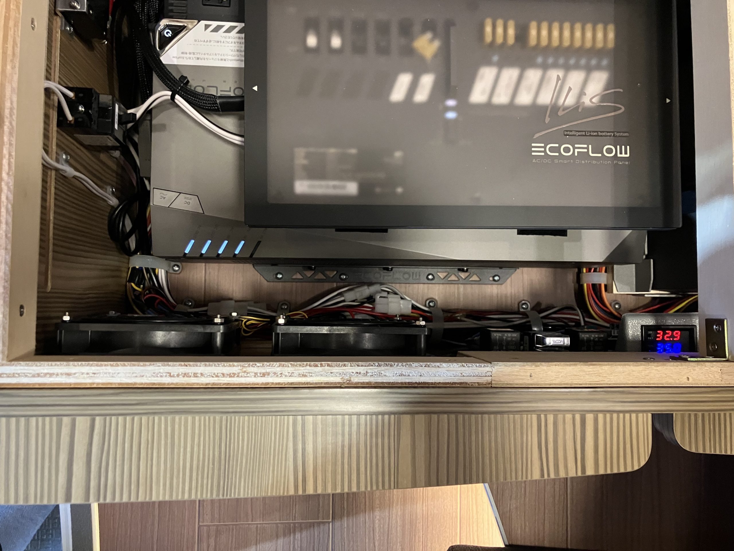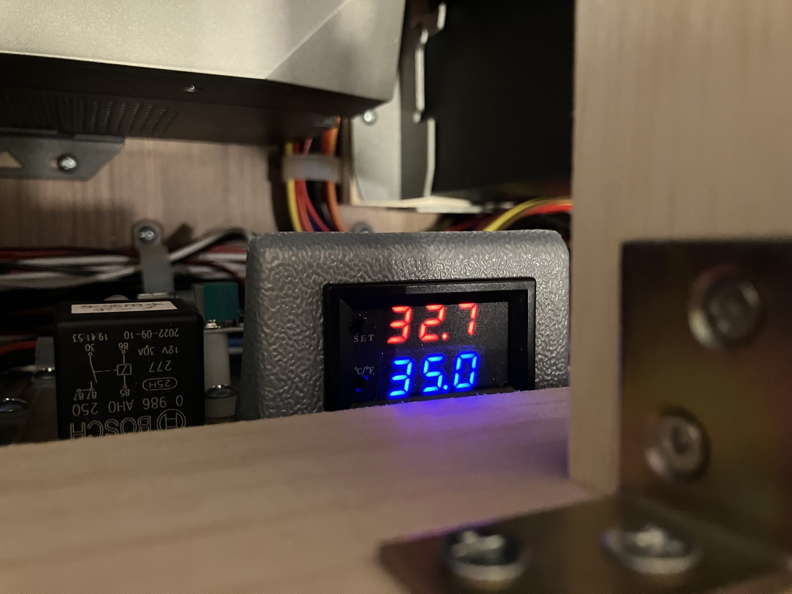 赤と青の数字が表示されている温度計があるのですが、赤が現在の電装庫内温度、青が強制冷却ファンが作動し始める温度になっています。
