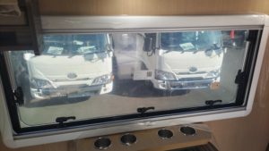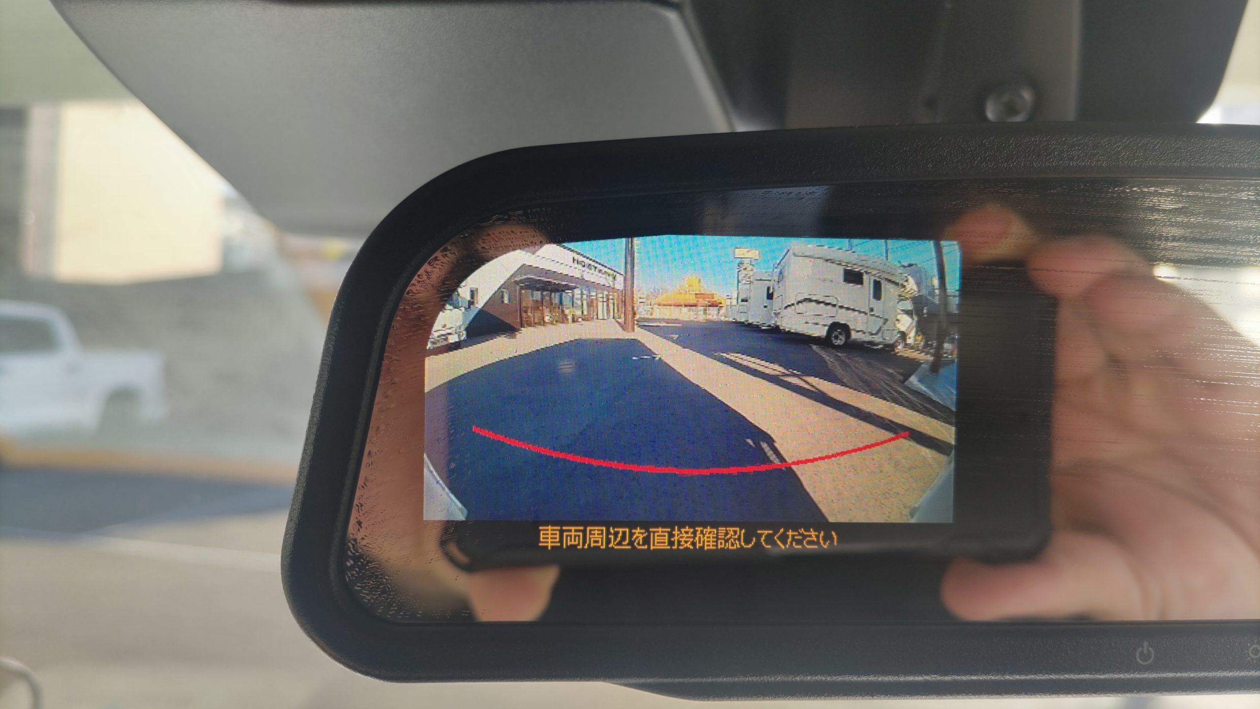 普段は通常のルームミラーなのですが、ギアをRに入れると写真のように後方映像が表示されるようになります。