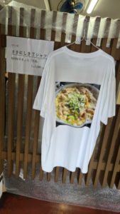 順番待ちで並んでいる横に、ホルモン煮込みのオリジナルTシャツが飾ってあります。