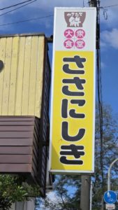 そのお店、【ささにしき食堂】は、VANTECH山形から、国道13号線を新庄市方面に向かって車を走らせ、尾花沢市芦沢に入り、左手に見えてくる黄色い【ささにしき】という看板が目印です。