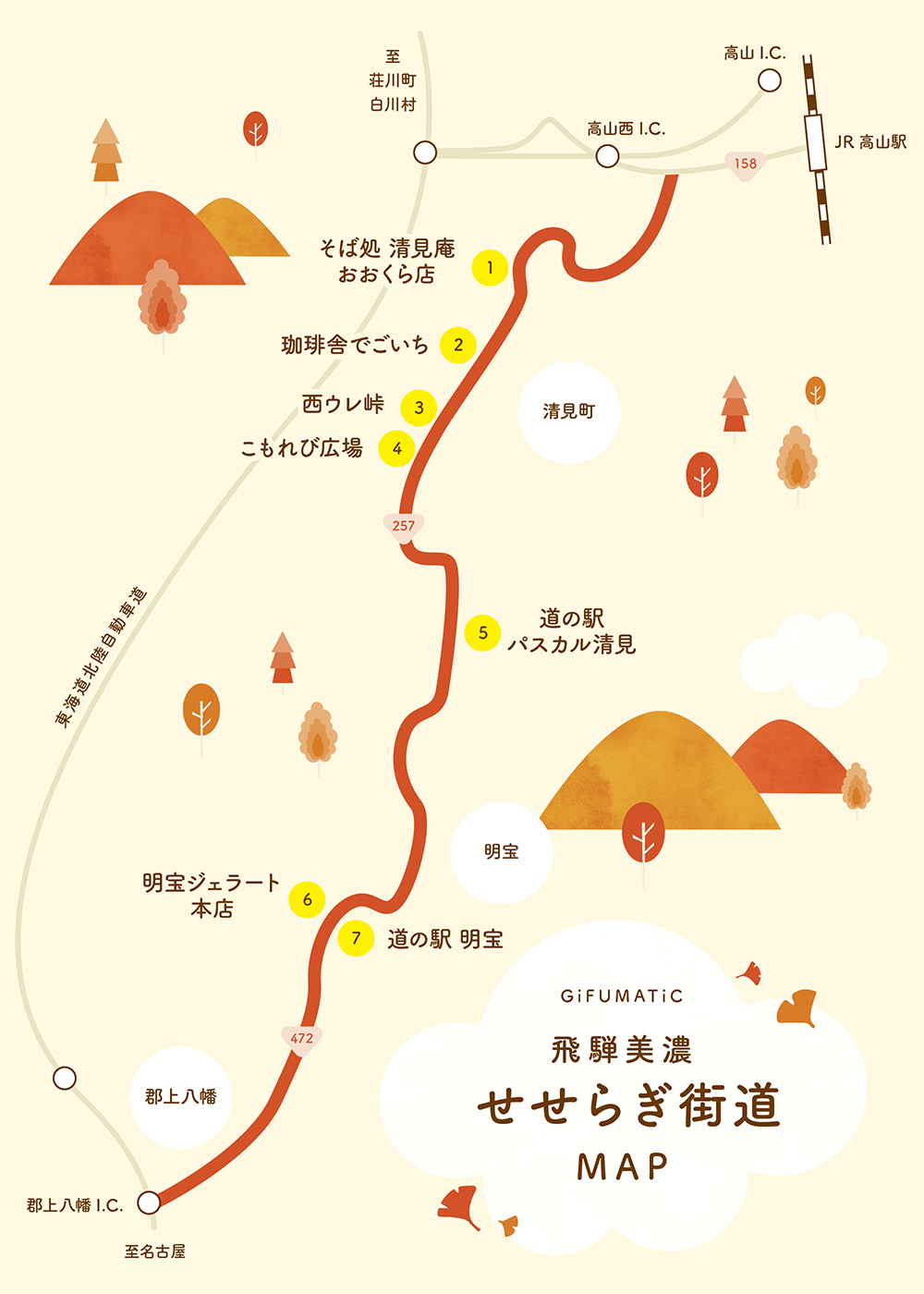 郡上八幡から高山までの約1時間半、途中には道の駅明宝やパスカル清見などがあり