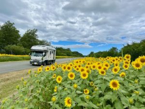 (ひまわりの中を駆け抜けるっす!秋田のひまわりロードは夏季限定っす)