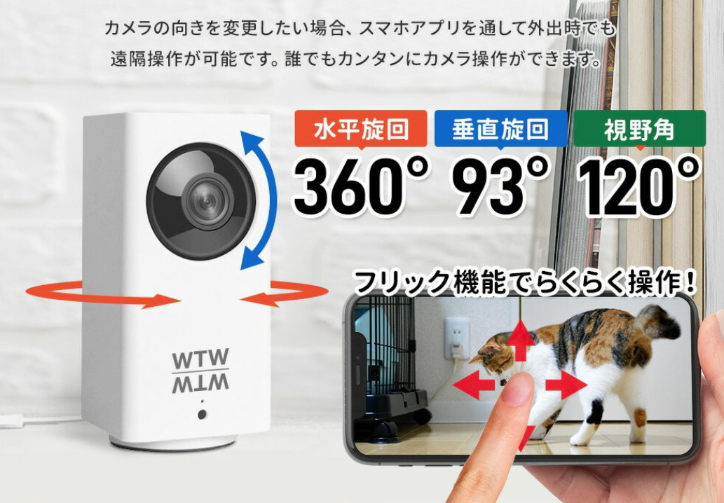 カメラの視野角は120°と広く、パン・チルトも可能ですので